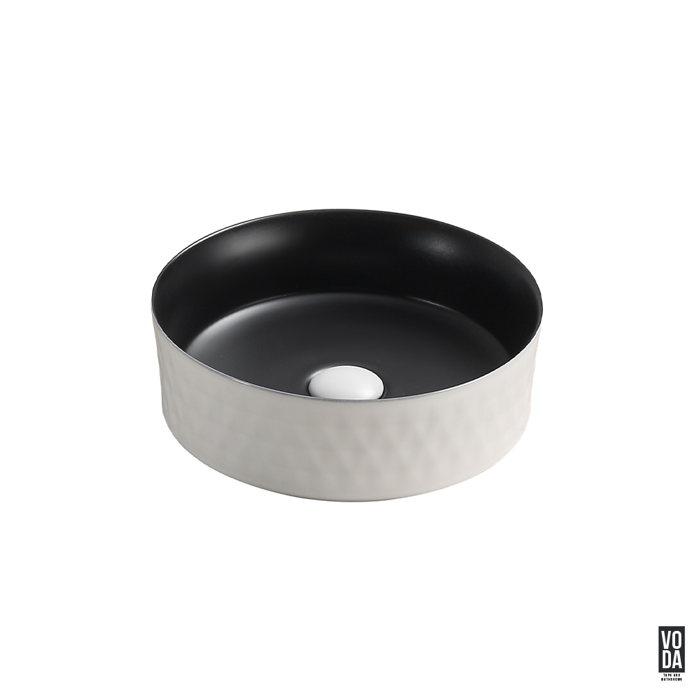 Ollia 360mm Round Diamond Texture Ceramic Above Counter Basin Matte White Outside Matte Black Inside