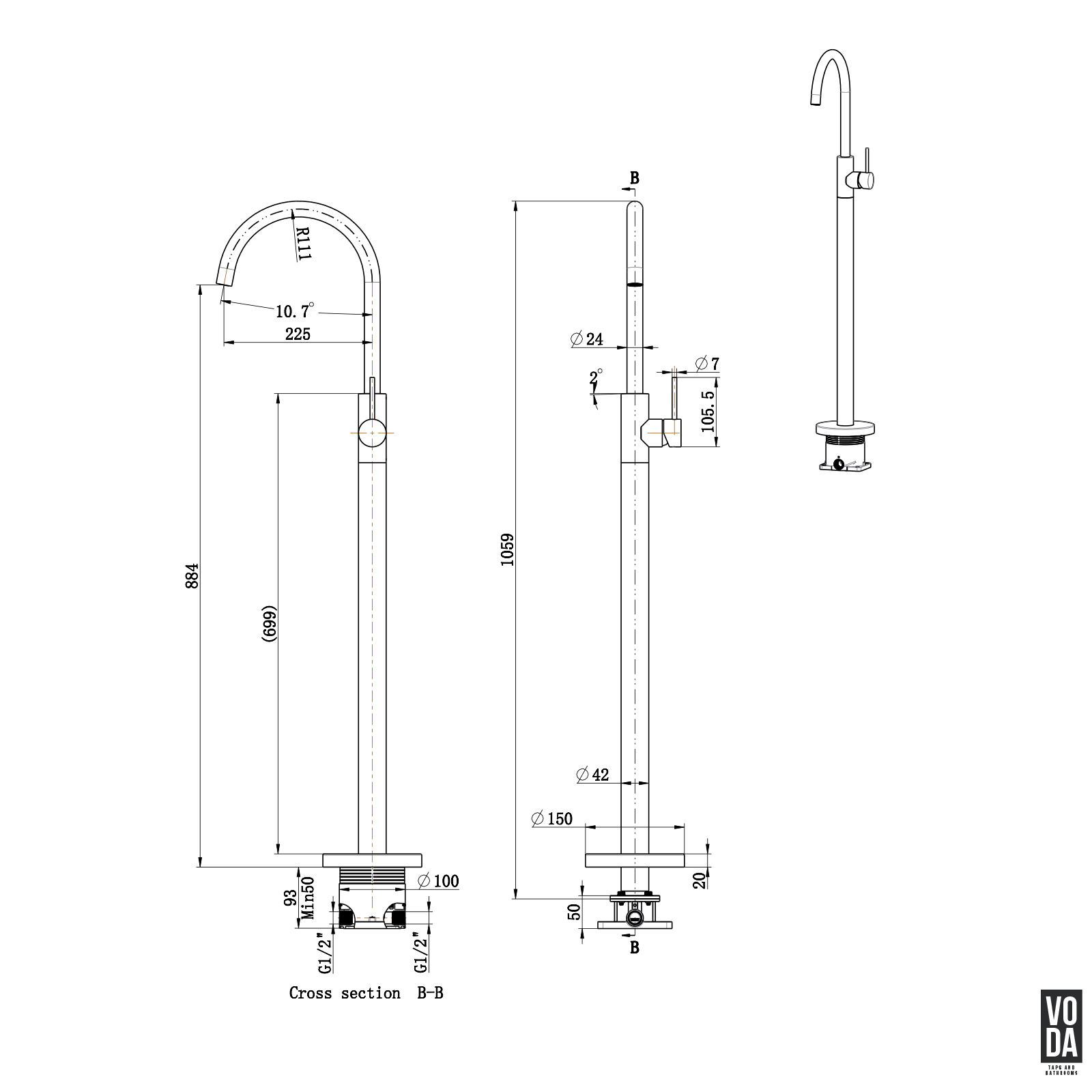 Pure Floor Standing Bath Filler with Mixer Brushed Gold